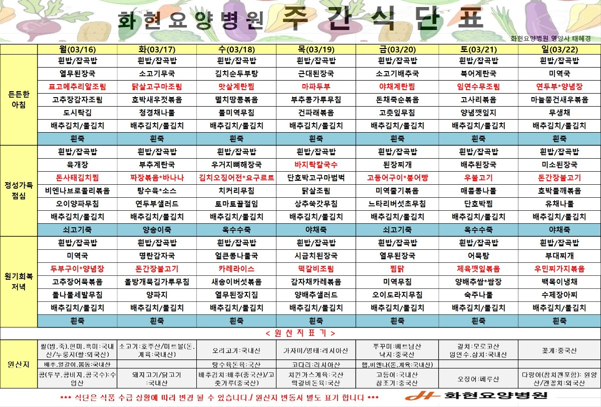 2026년 3월 세째주 식단표